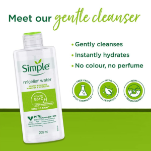 Simple Micellar Cleansing Water is a gentle and effective cleansing solution specifically designed for sensitive skin. The 400ml bottle contains micelles, which are tiny oil molecules that attract and remove dirt, oil, and makeup from the skin without causing irritation. This cleansing water is free from harsh chemicals, artificial fragrances, and colors, making it suitable for daily use to remove impurities and leave the skin feeling clean, refreshed, and hydrated.